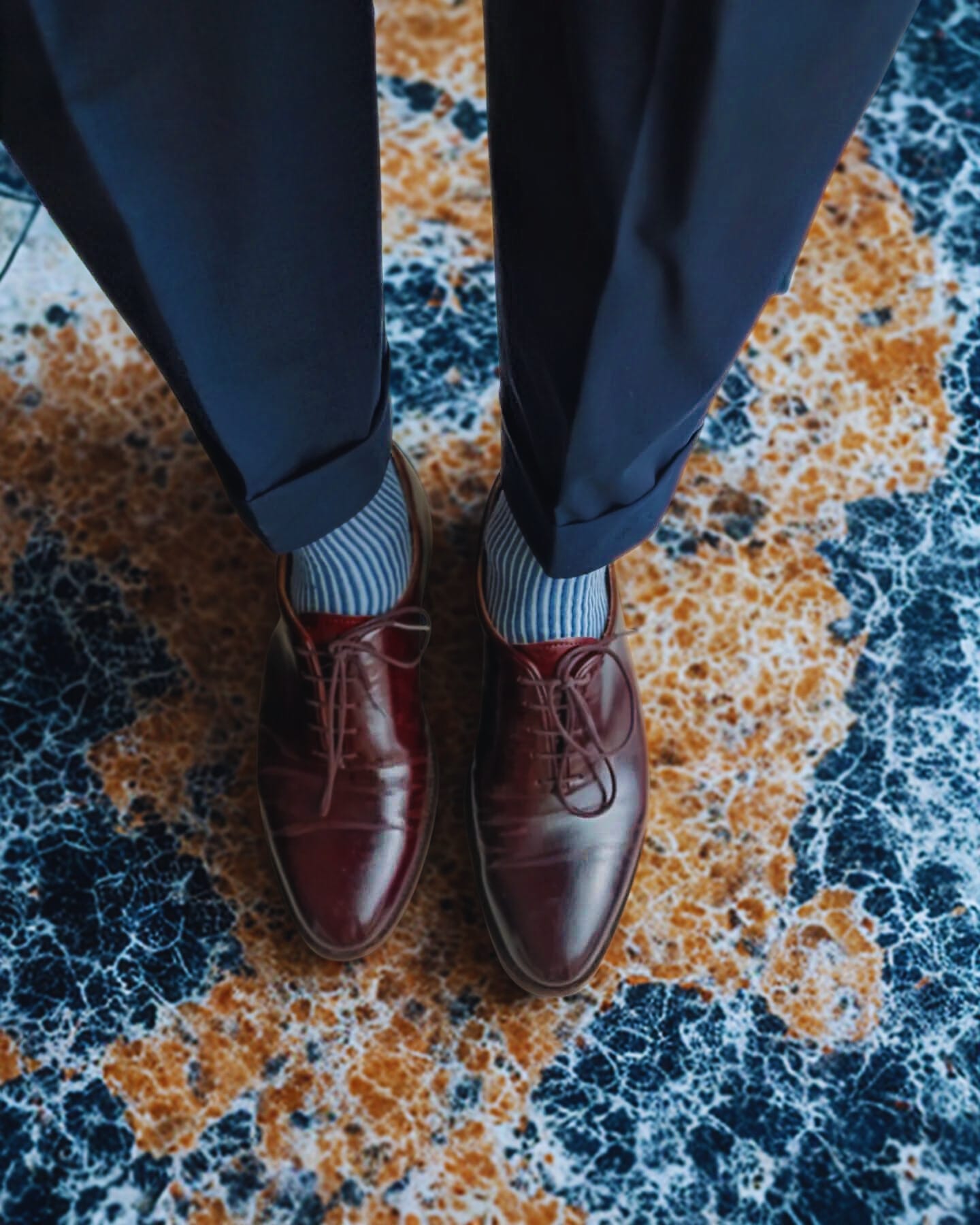 Then there’s the striped socks peeking out with mischief, the oxblood cap-toes grounding the look in tradition, and a touch of silver at the wrist reminding you that time, like style, is what you make of it.