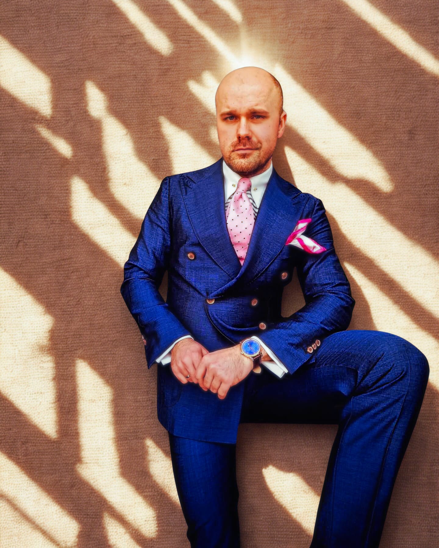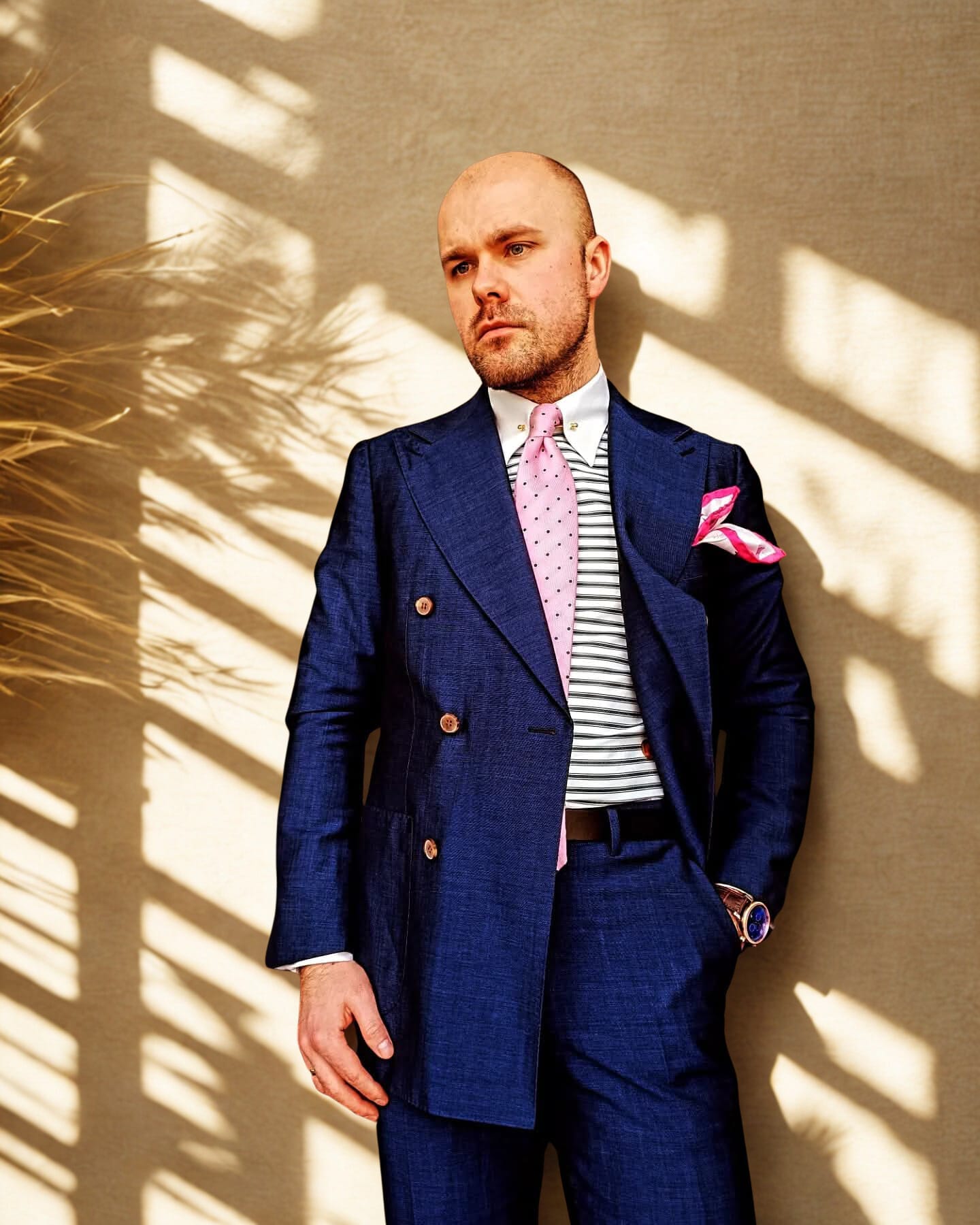 We dress how we feel. Or how we want to feel. Sometimes both. That deep blue double-breasted suit, for example—it's armor. Sleek, structured, confident. But pair it with a bubblegum tie and a striped shirt and suddenly you’ve given the armor a personality. A smirk. A little therapy, even. If Patrick Bateman ever decided to turn the page, go to therapy, unpack his childhood, and discover lavender fragrance and pink pocket squares—he’d probably land here.