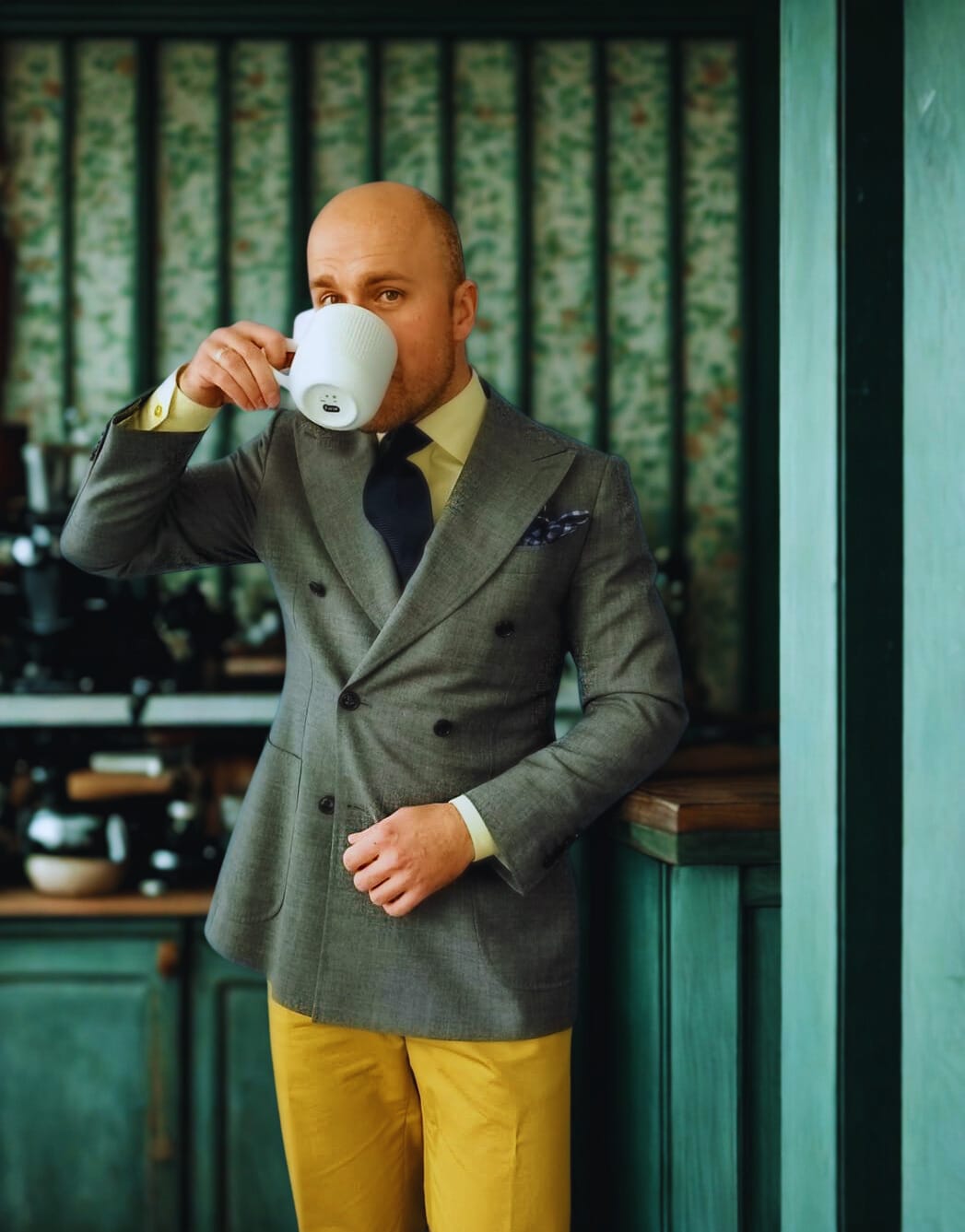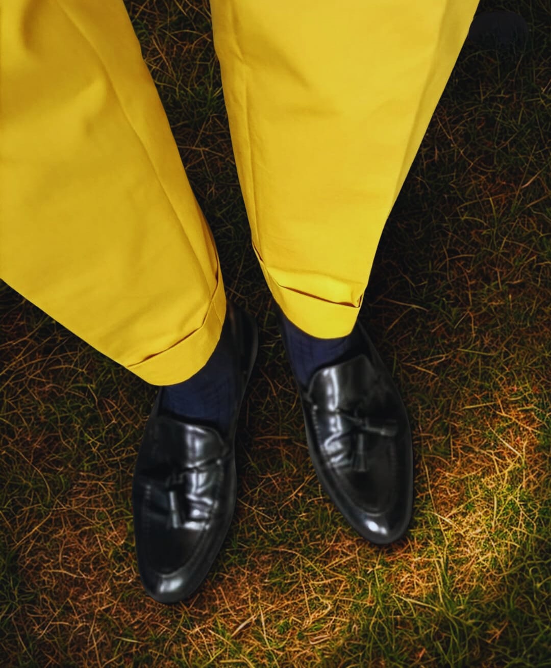 And then there’s the yellow. It’s not a color. It’s a statement. A provocation. A small rebellion against grey skies, cubicles, and the subtle tyranny of business casual. Worn with blue tassel loafers and confidence (always confidence), it doesn’t apologize for anything. Why should it?