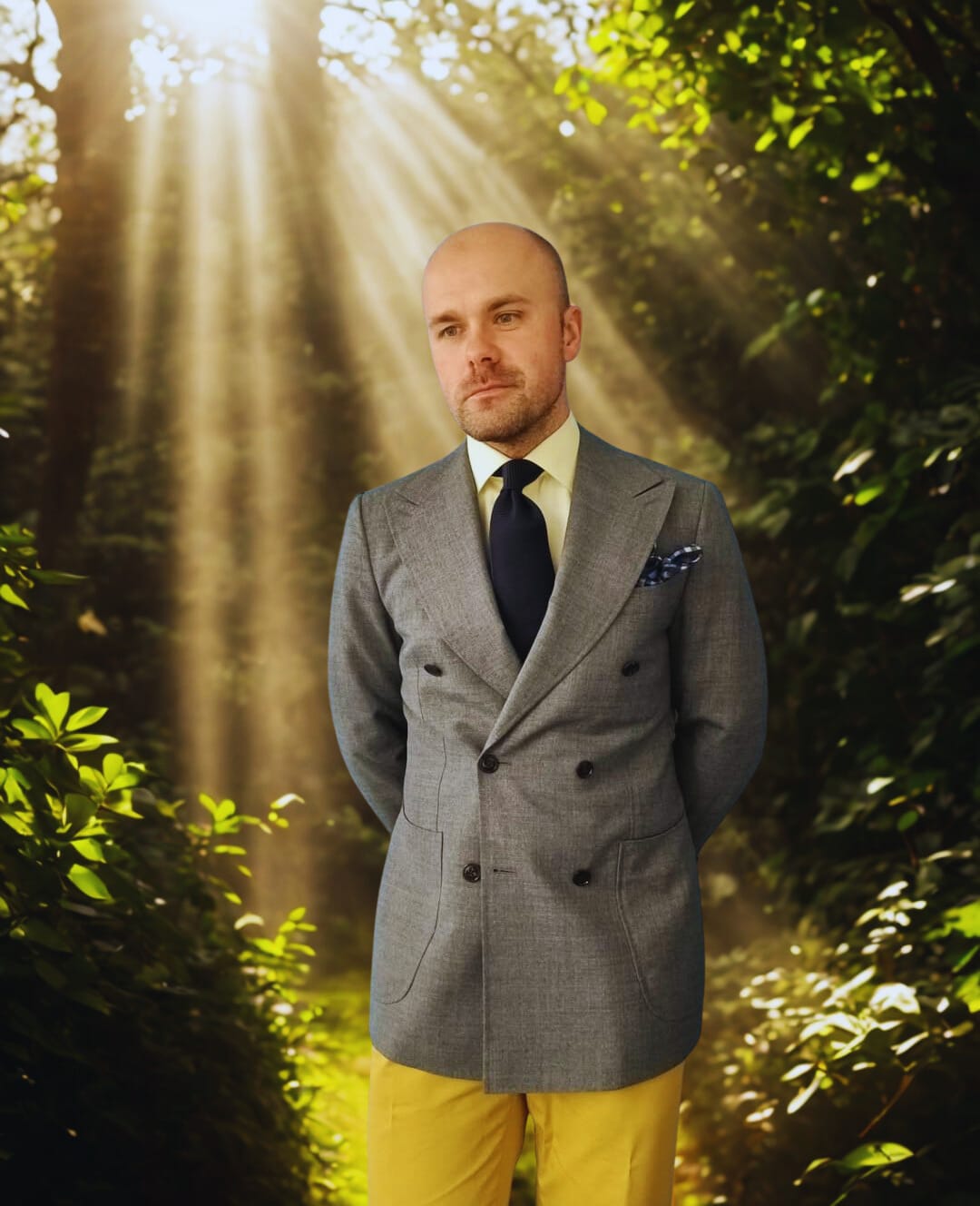 What you see here is not new. In fact, these are old photos. Remnants of a time when I felt experimental, maybe a bit feral with fabric. Yellow trousers that blind and charm in equal measure. A grey DB jacket worn over a lemon pastel shirt, paired with a navy tie so classic it could’ve walked out of a Savile Row catalogue. Pocket squares held out like offerings—one flamingo-loud, the other checkered and reserved. Two moods. One closet. And somehow, they both felt honest.