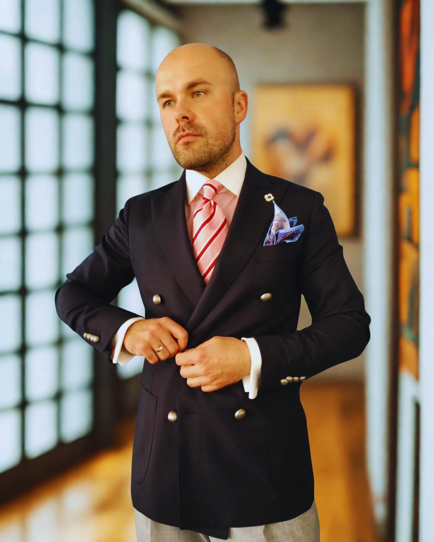 One day, it’s a navy double-breasted jacket, brass buttons catching the light, a pink silk tie whispering of old-world diplomacy. The next, it’s a cobalt polo, sleeves hugging the biceps like a discreet handshake, trousers cut with just enough room to show you’re not afraid of comfort.
