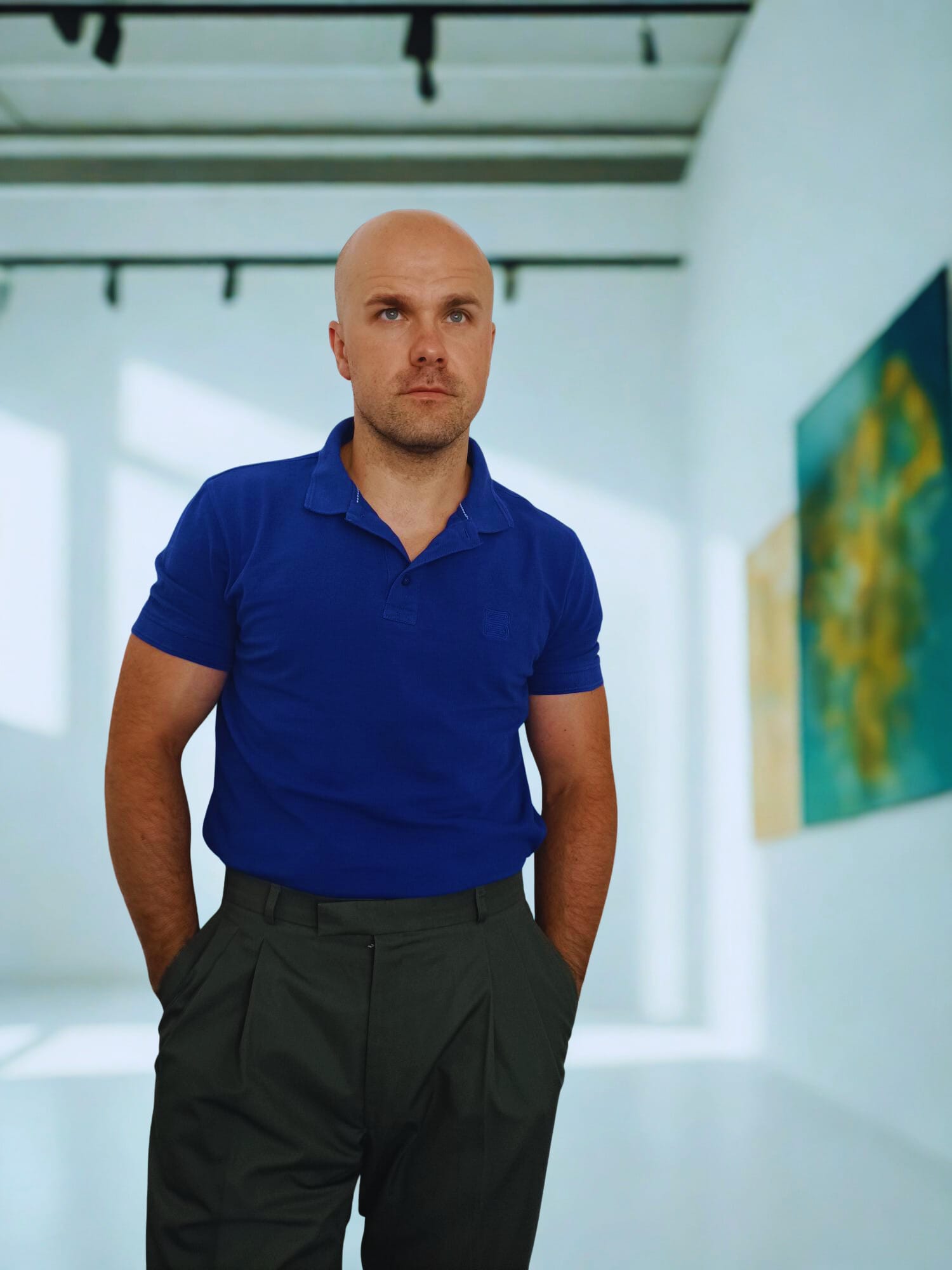 In the first frame, we see the ease of a smart-casual stance: polo shirt tucked, pleats falling in soft lines, hands resting in pockets as if the world outside the gallery walls can wait. This is not dressing down — this is dressing just enough, a subtle handshake between elegance and leisure.