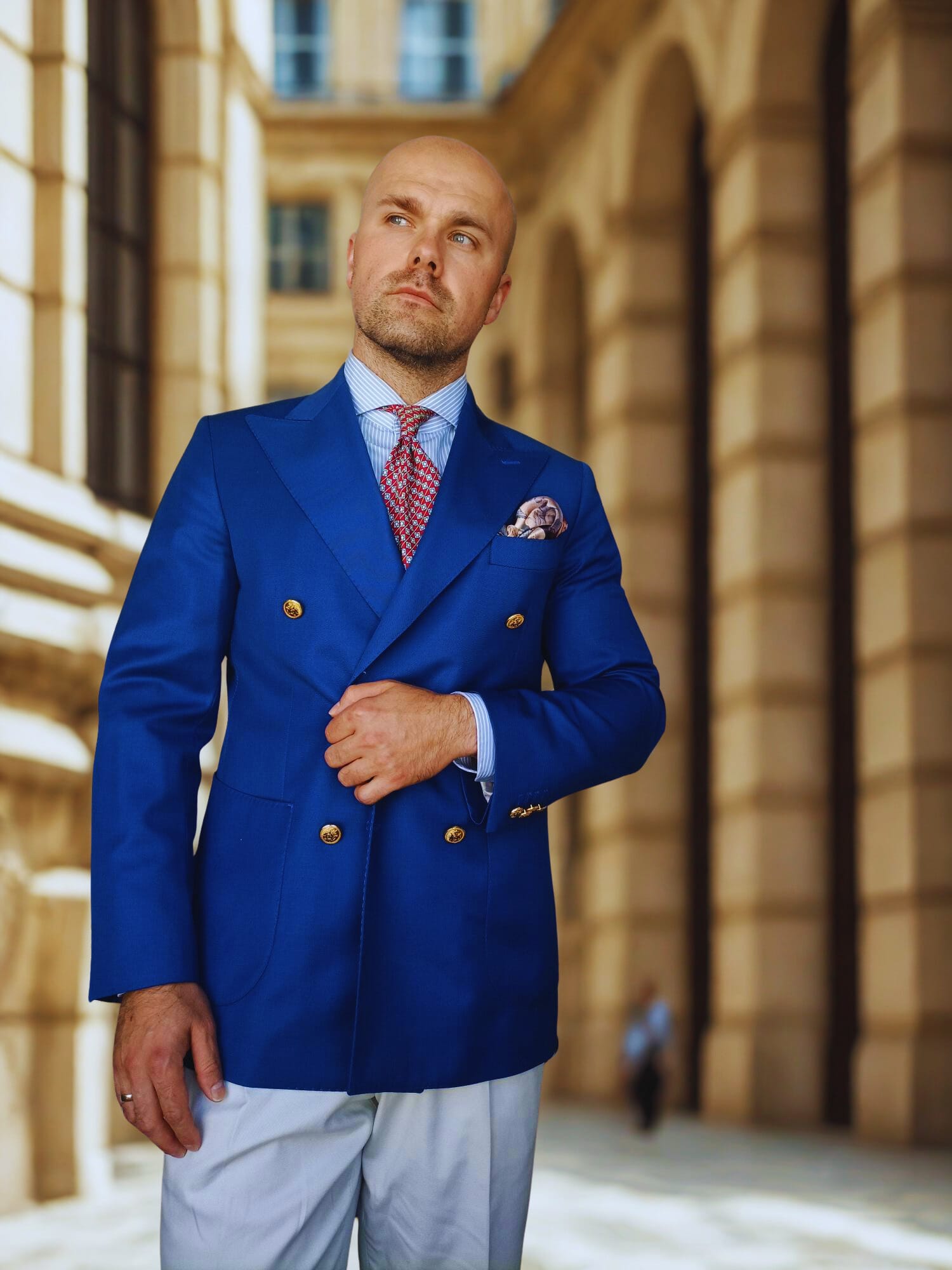 It’s also the rare colour that flatters almost everyone, from the cautious accountant to the creative rebel. Wear it with restraint — a tie, a pocket square — and you’ve got subtle elegance. Go full tilt — double-breasted, gold buttons, crisp white trousers — and you’re making a statement that’s impossible to ignore.