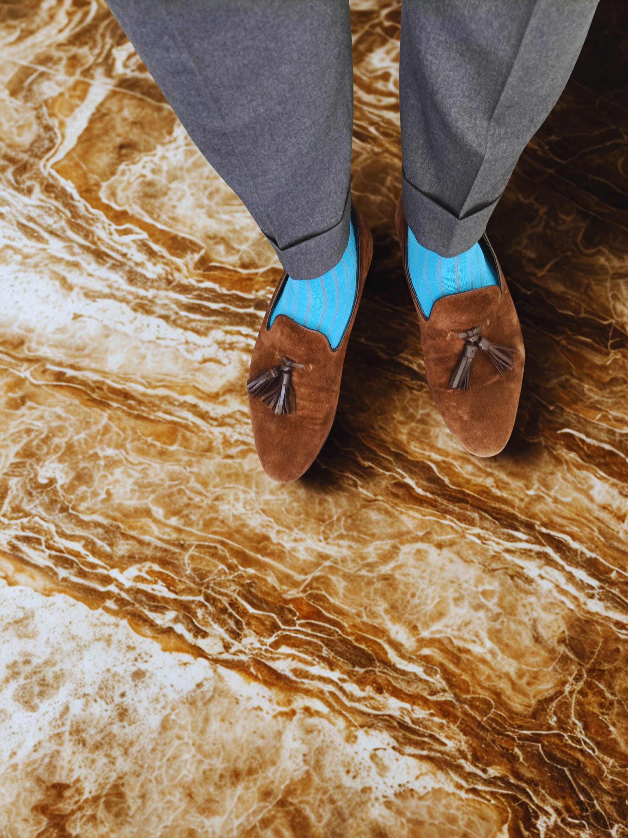 A turquoise silk tie so vivid it could short-circuit a camera sensor.