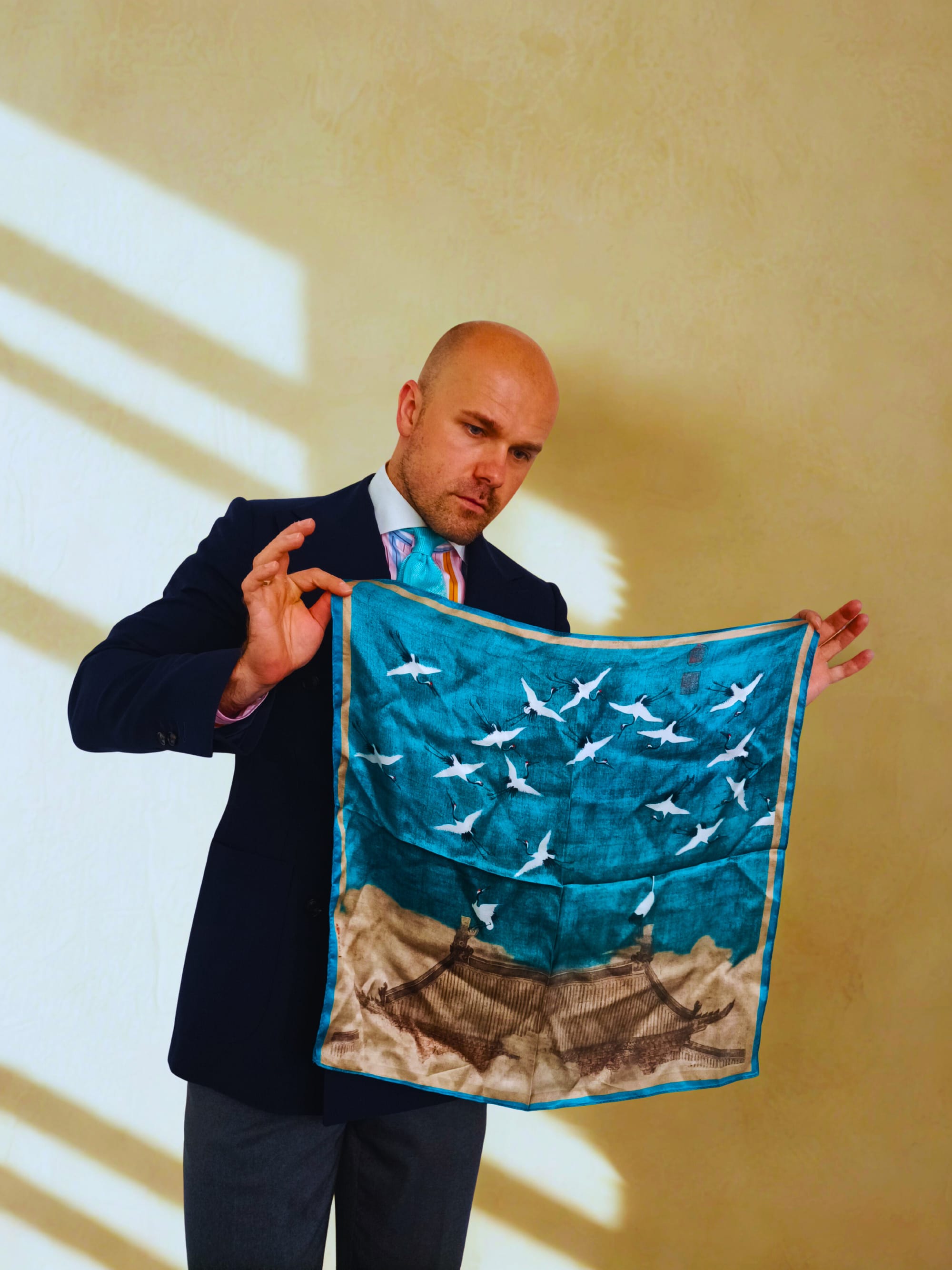 A pocket square that’s less “neatly folded accessory” and more “postcard from a dream” — cranes in flight over water, a reminder that imagination belongs in the breast pocket.