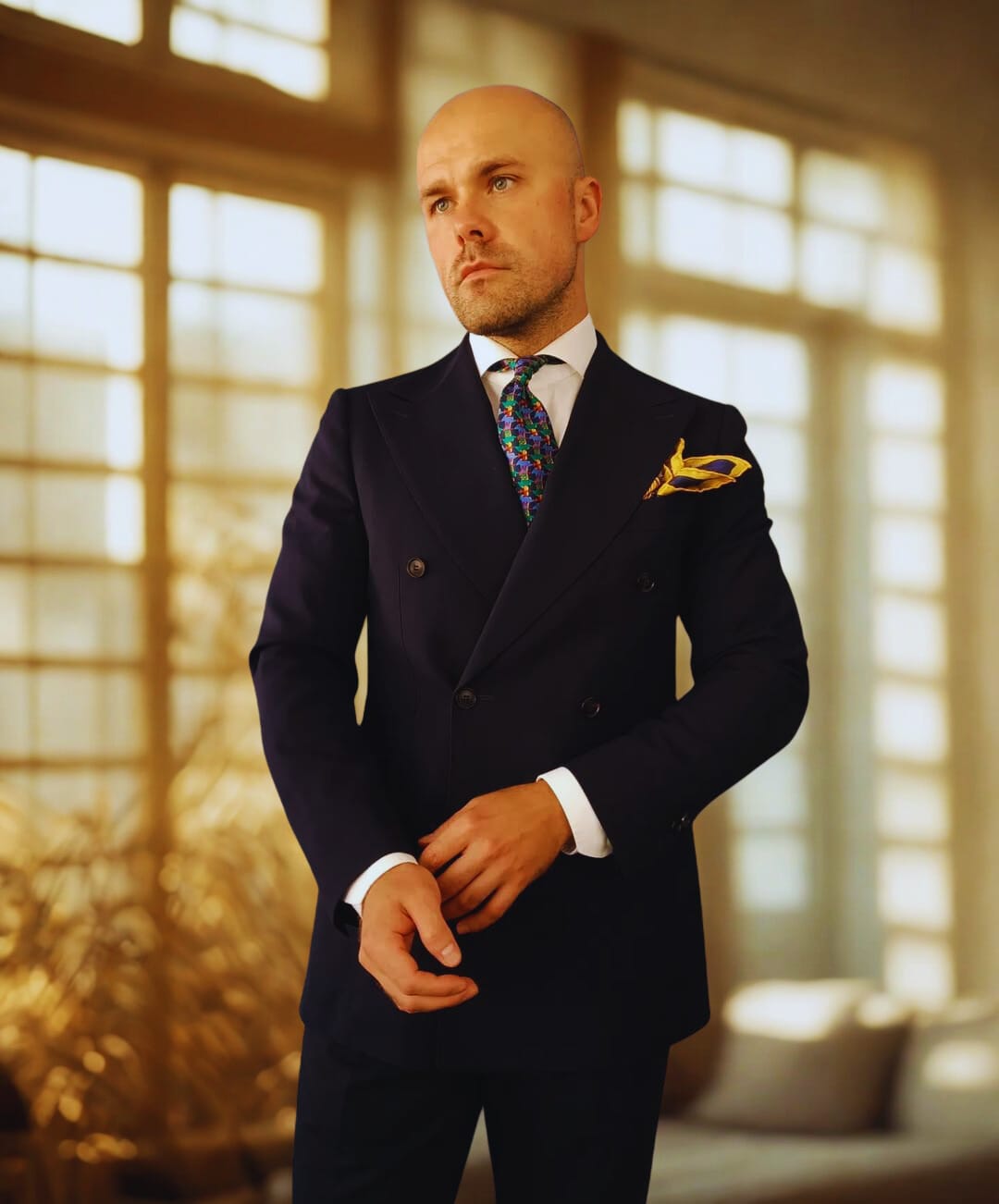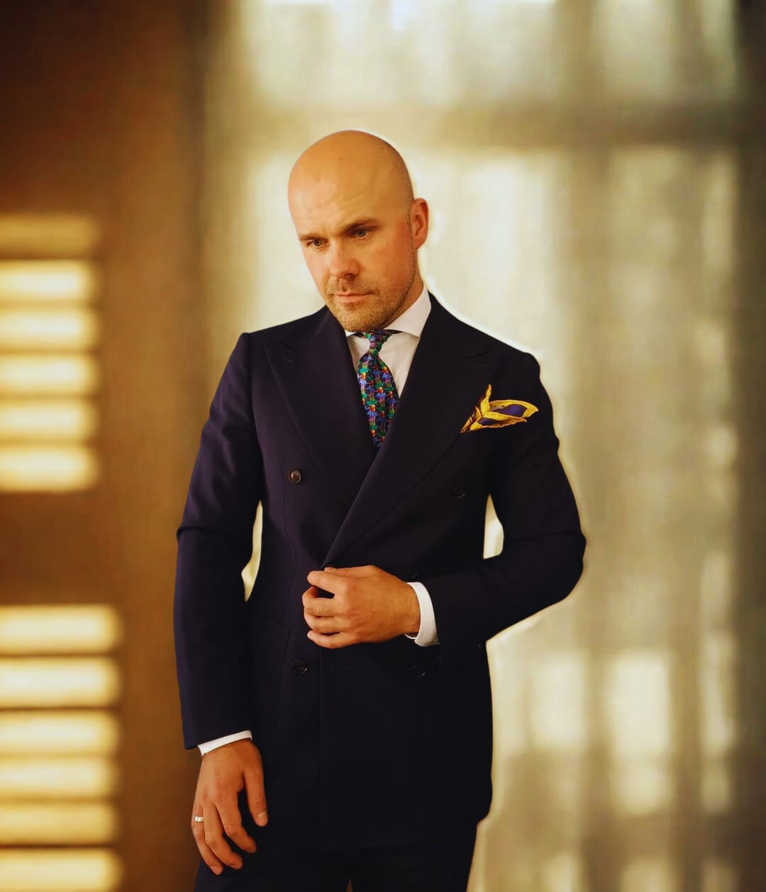The suit? Sharp navy. Double-breasted. The kind that speaks in clean lines and quiet authority.