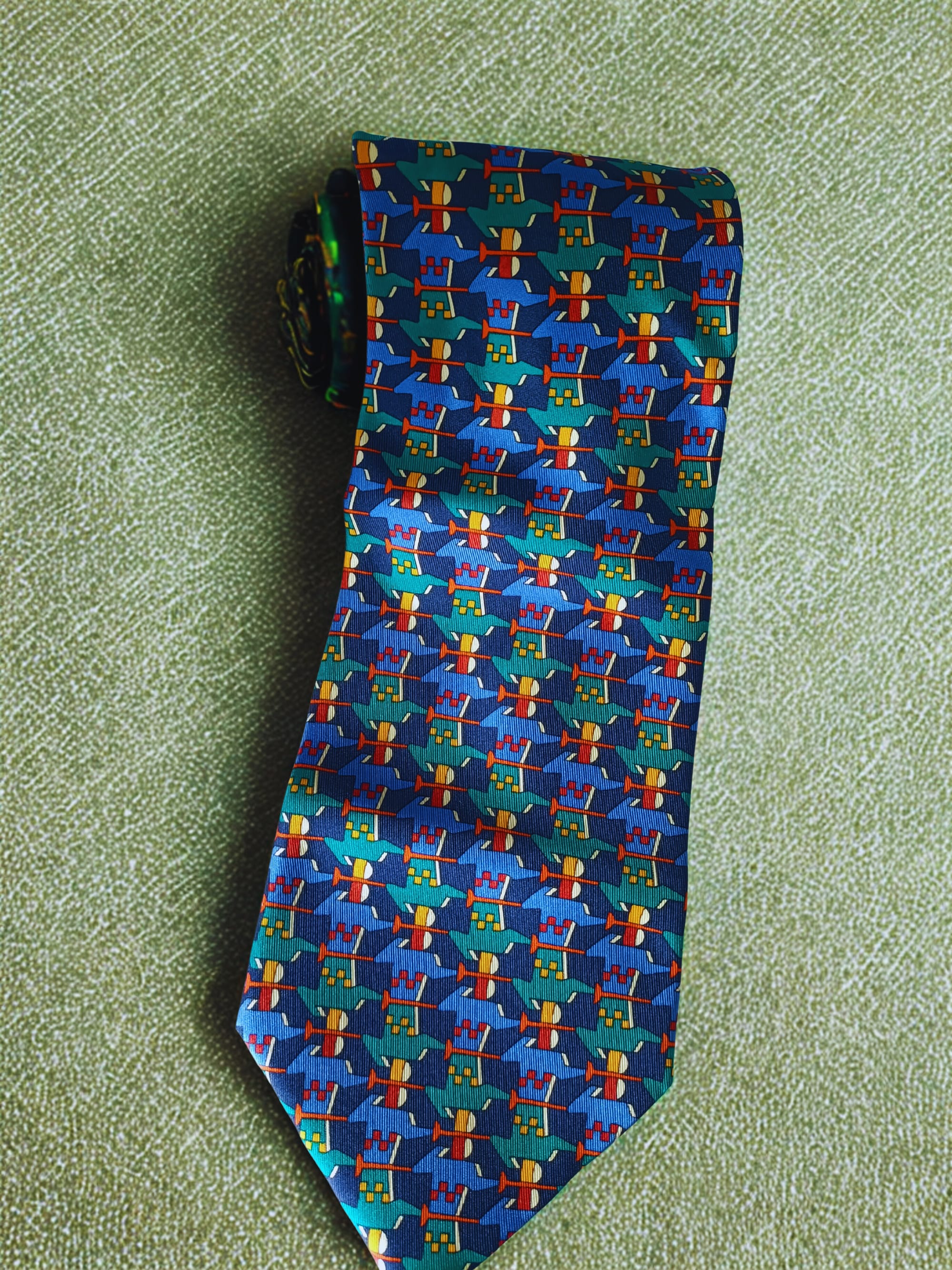 A Nazareno Gabrielli tie that looks like it escaped from a Pop Art gallery — green elephants(?) parading through boardroom expectations like they own the place. It doesn’t ask for permission. It doesn’t need to.