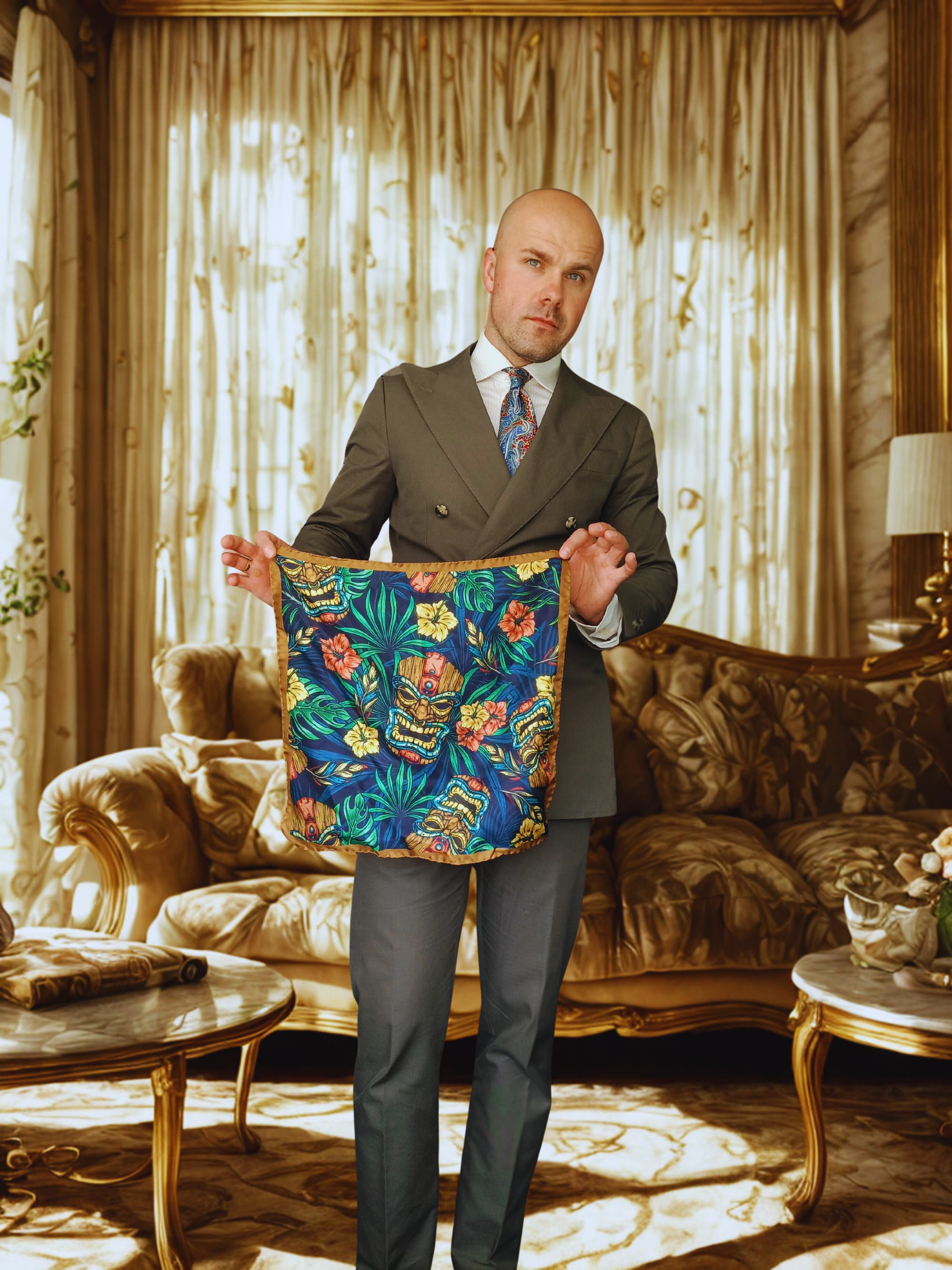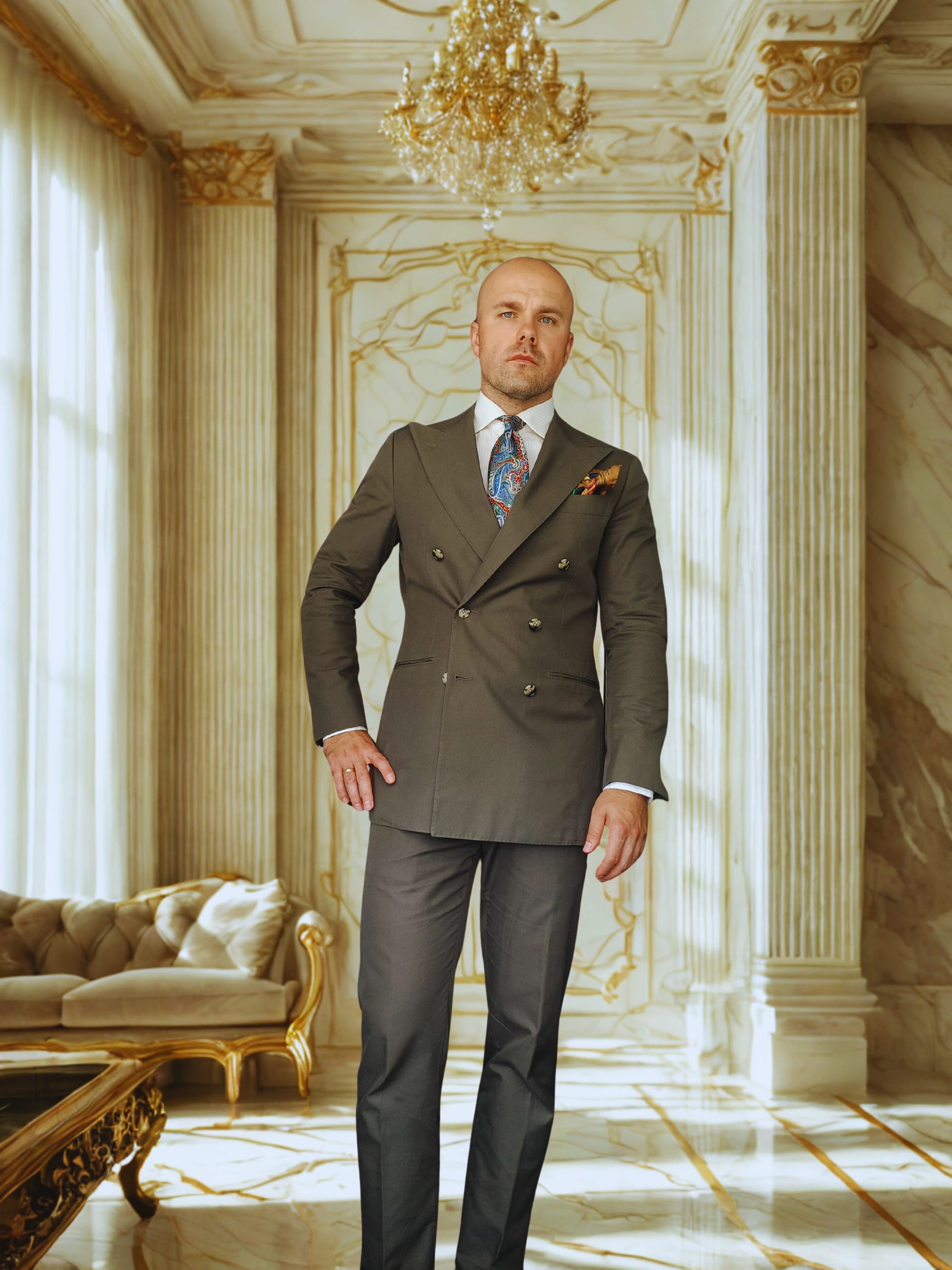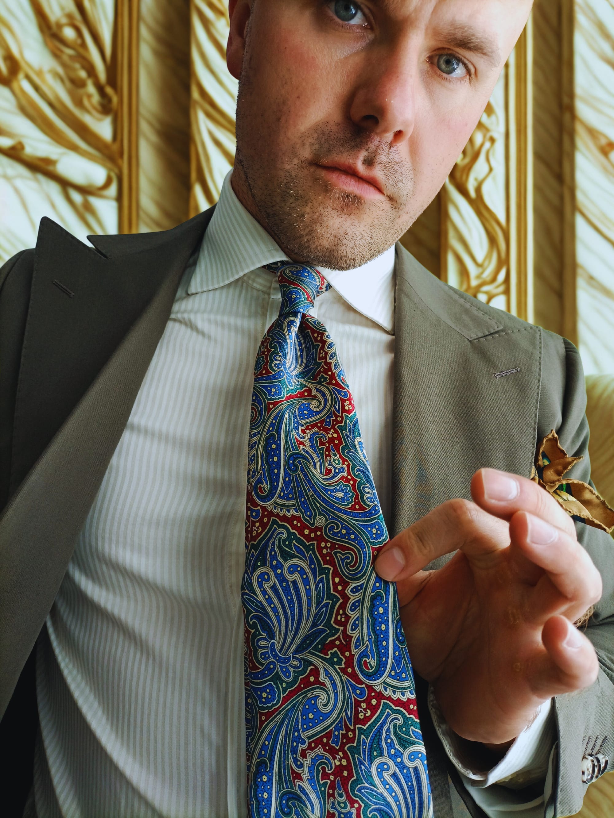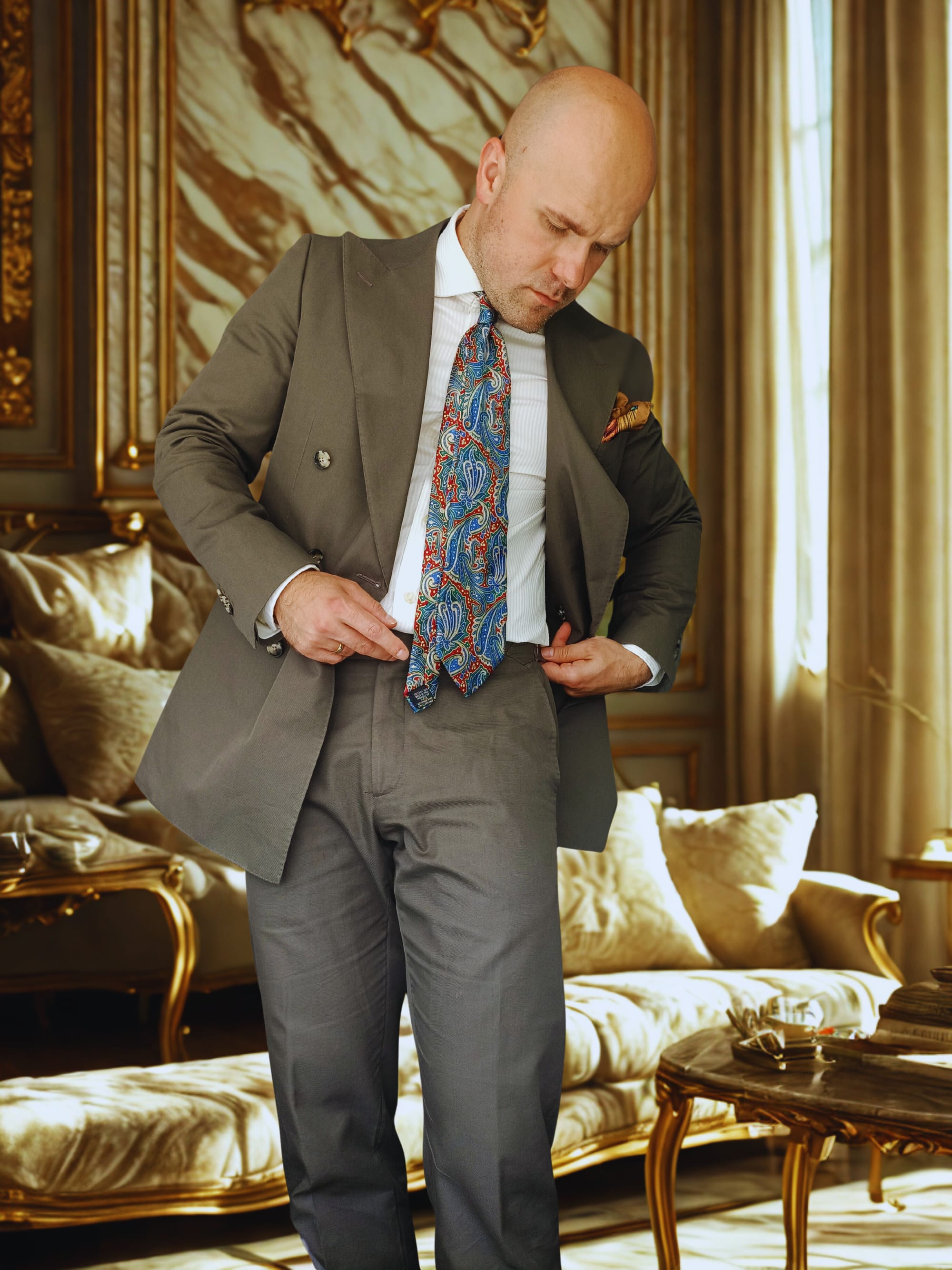 Today, I wore a khaki double-breasted suit that doesn’t apologize for existing. A paisley tie in green, red, and blue — more personality than most wardrobes combined. Brown loafers because elegance doesn’t need laces to walk tall. And in my breast pocket, a square bearing a mask — because every room is a stage, and I don’t mind playing the lead.