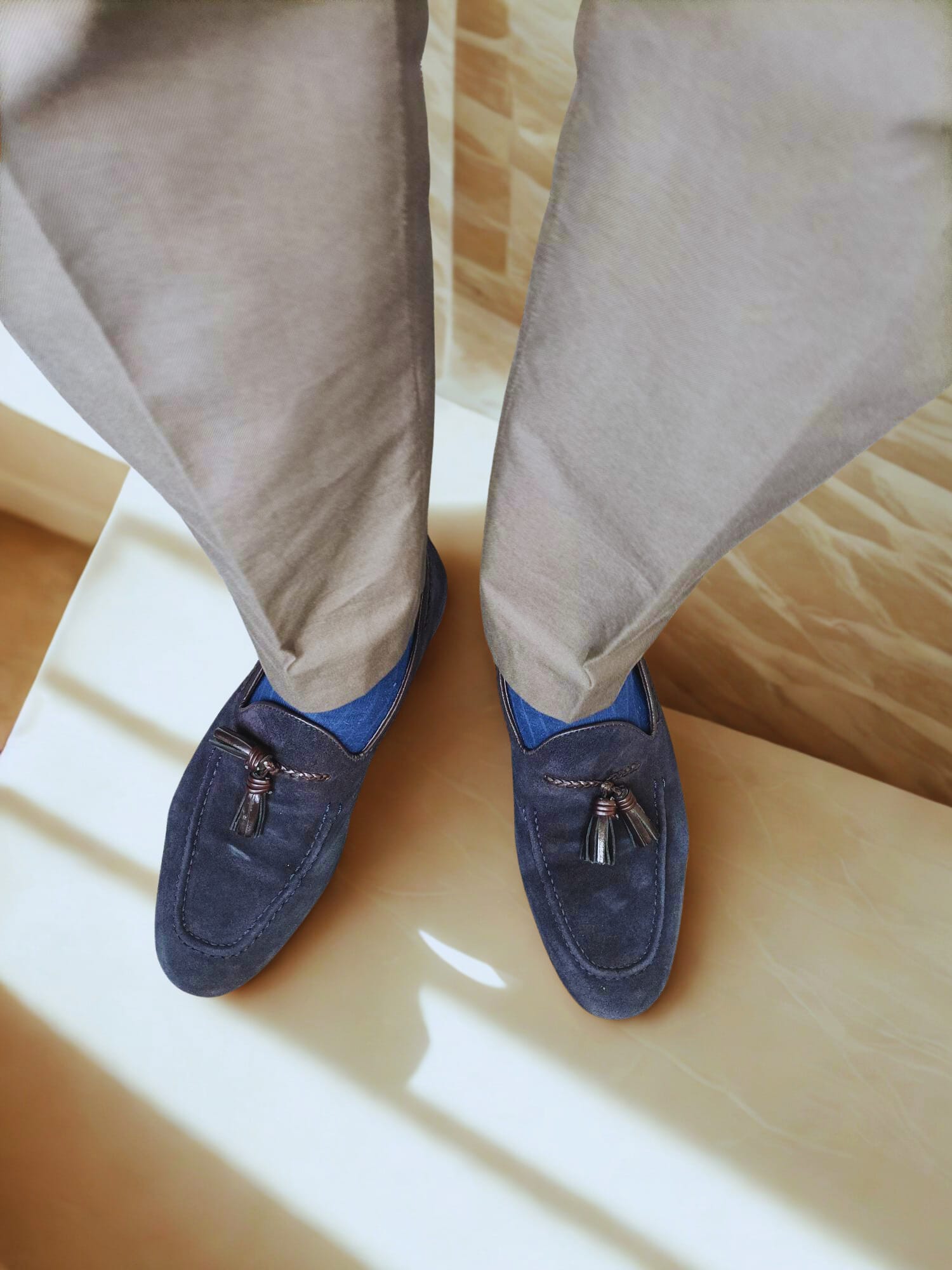 Take today’s outfit, my own little contribution: stone-grey double-breasted jacket, subtle check, taupe trousers, navy suede loafers. A clean palette, anchored by texture and contrast. A look designed not to scream, but to resonate. It’s what I’d call worth posting. Not because it’s perfect — perfection is sterile — but because it adds to the conversation.