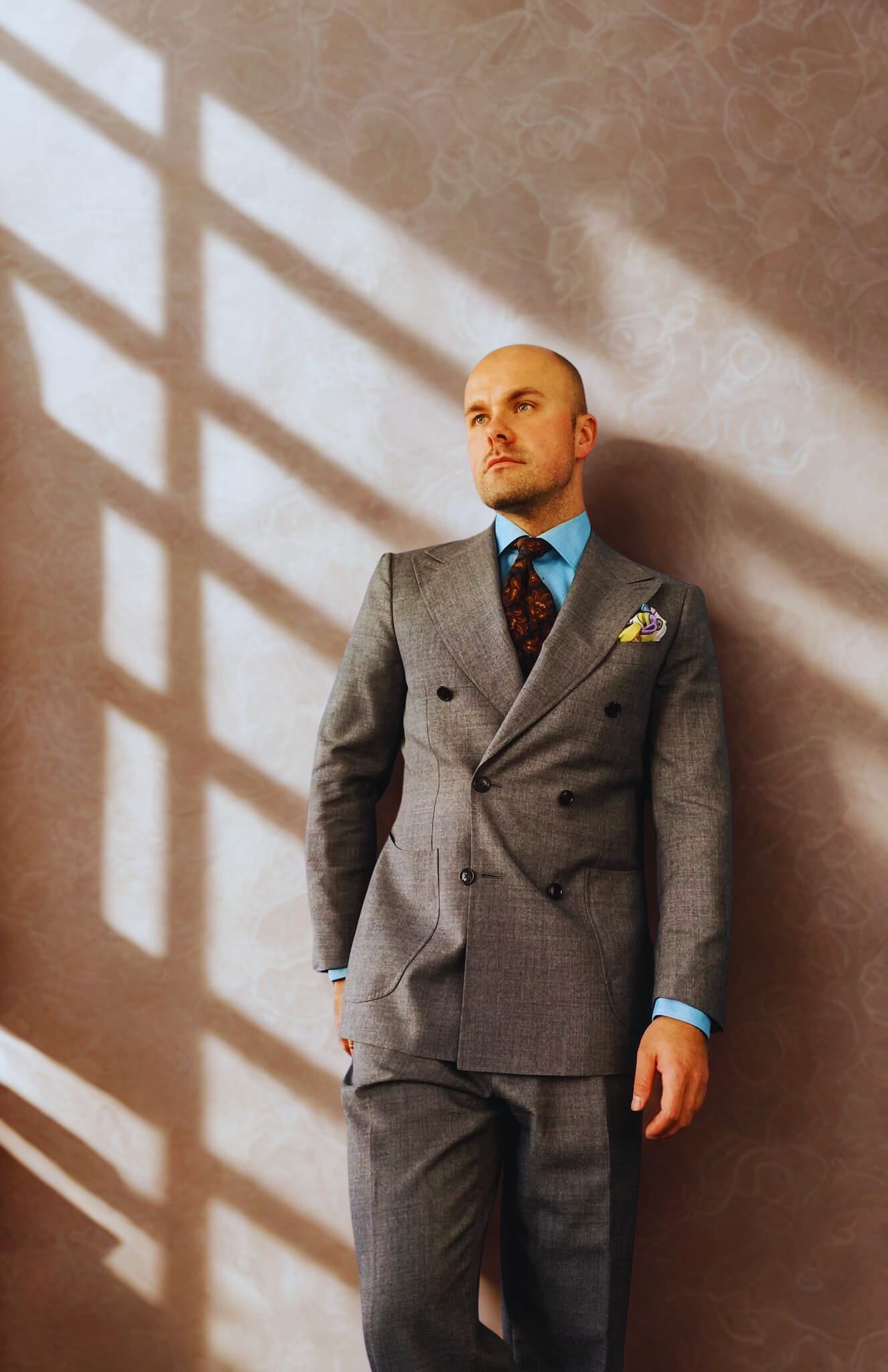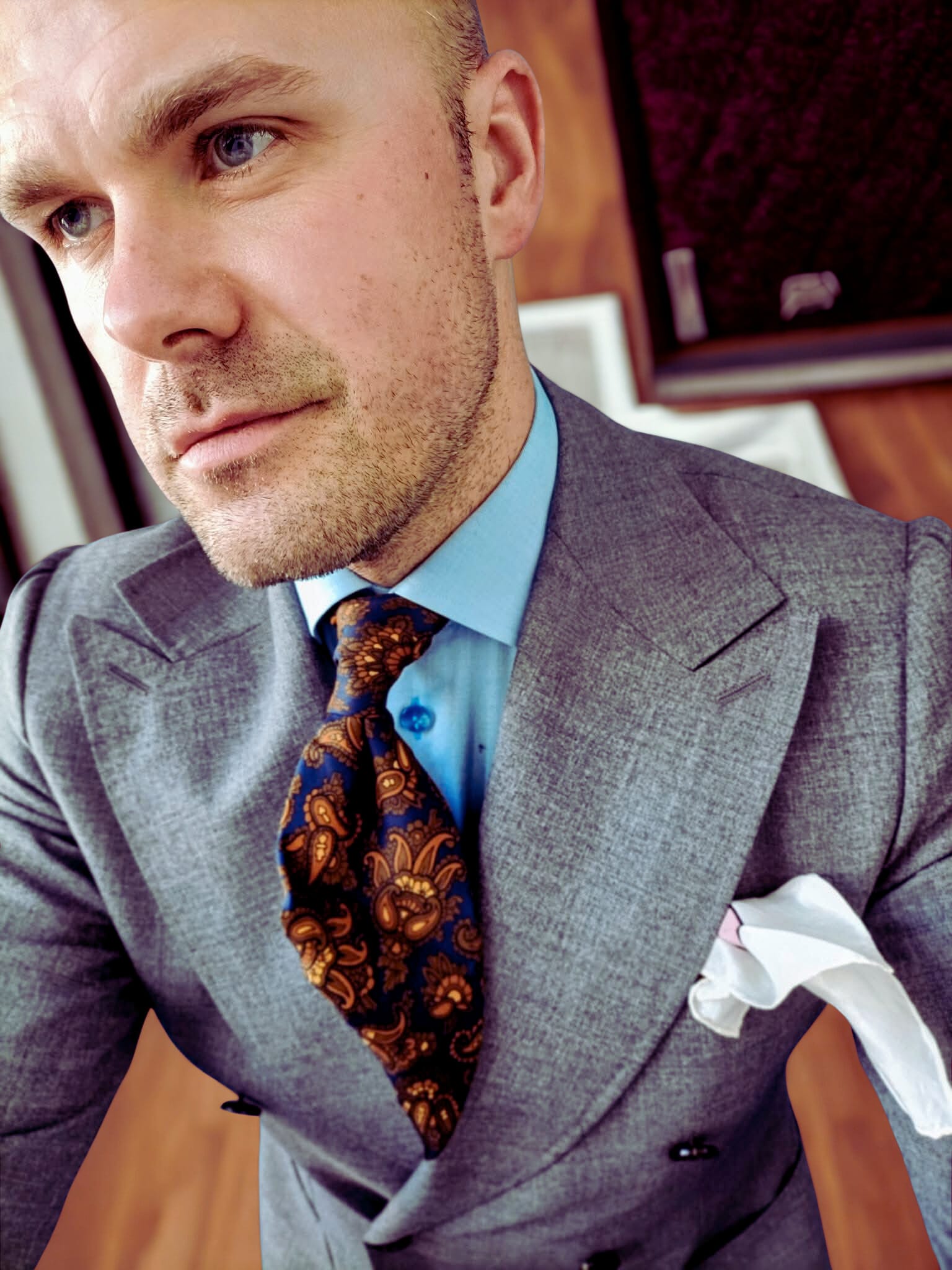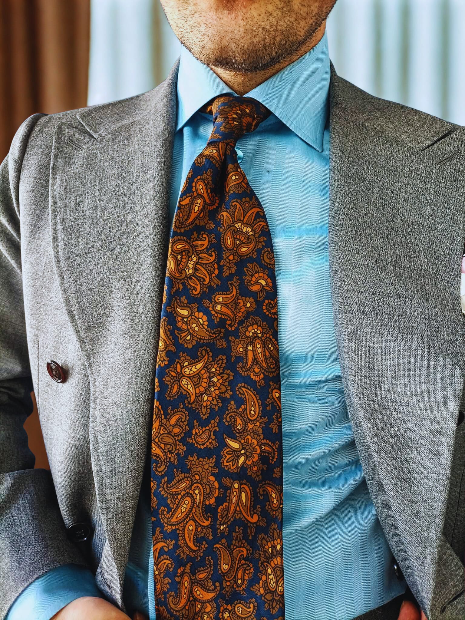 Grey gives you space. Pair it with a sky-blue shirt, and it breathes. Add a paisley tie in burnt orange and navy, and suddenly you’re telling a story. A modern-day renaissance man who understands the art of restraint and the thrill of detail. Pocket square? Just a flick of character. Whether it’s white linen, lavender silk, or a printed flourish—it always works. Grey allows it.