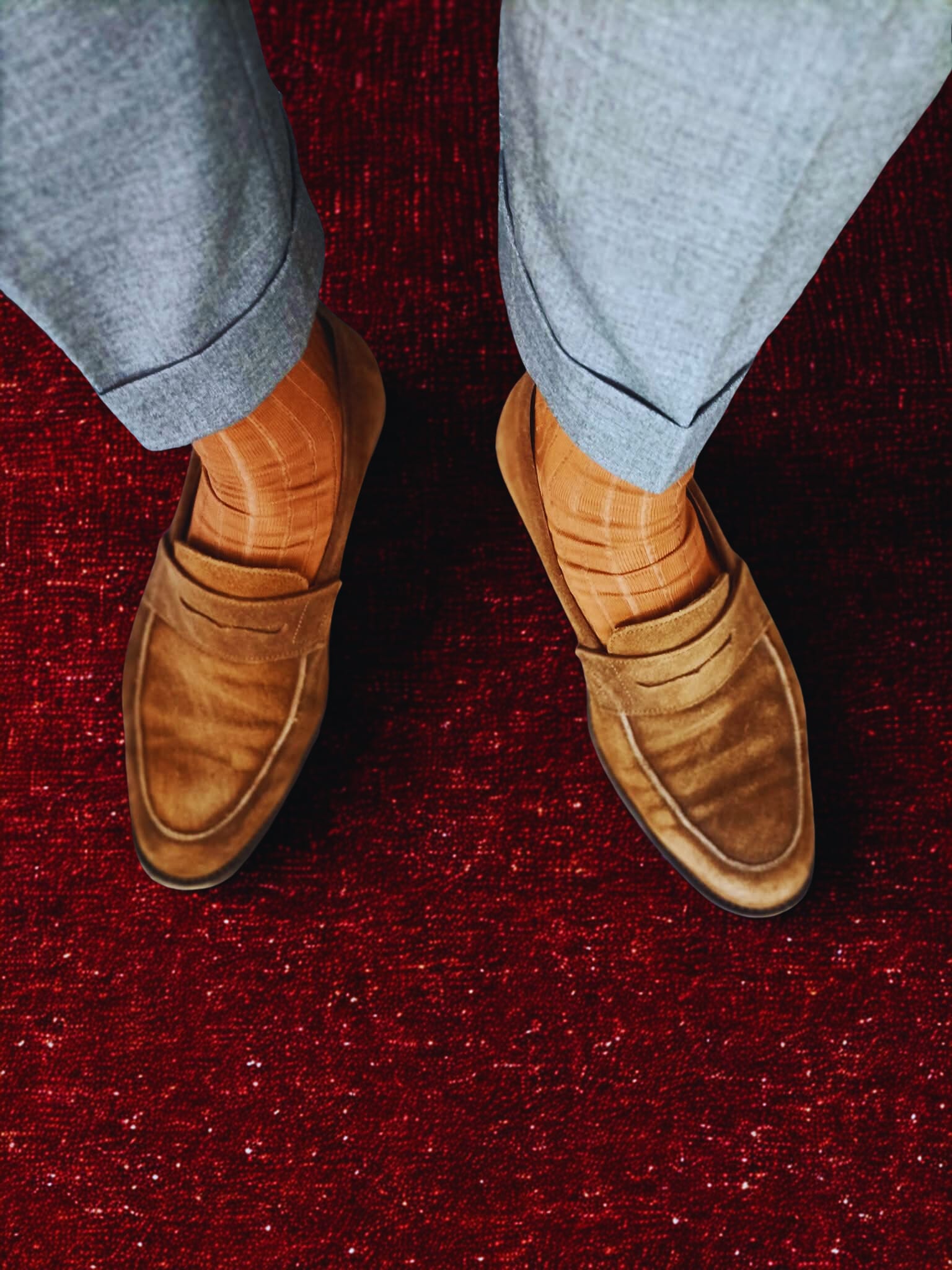 In a world obsessed with prints and patterns, texture is the last luxury. This grey suit doesn’t need gimmicks. The weave catches light like stone warmed by the afternoon sun. It shifts between steel and smoke depending on the hour, the lighting, the mood. And when you pair it with suede loafers and caramel socks? You’re writing poetry with your feet.