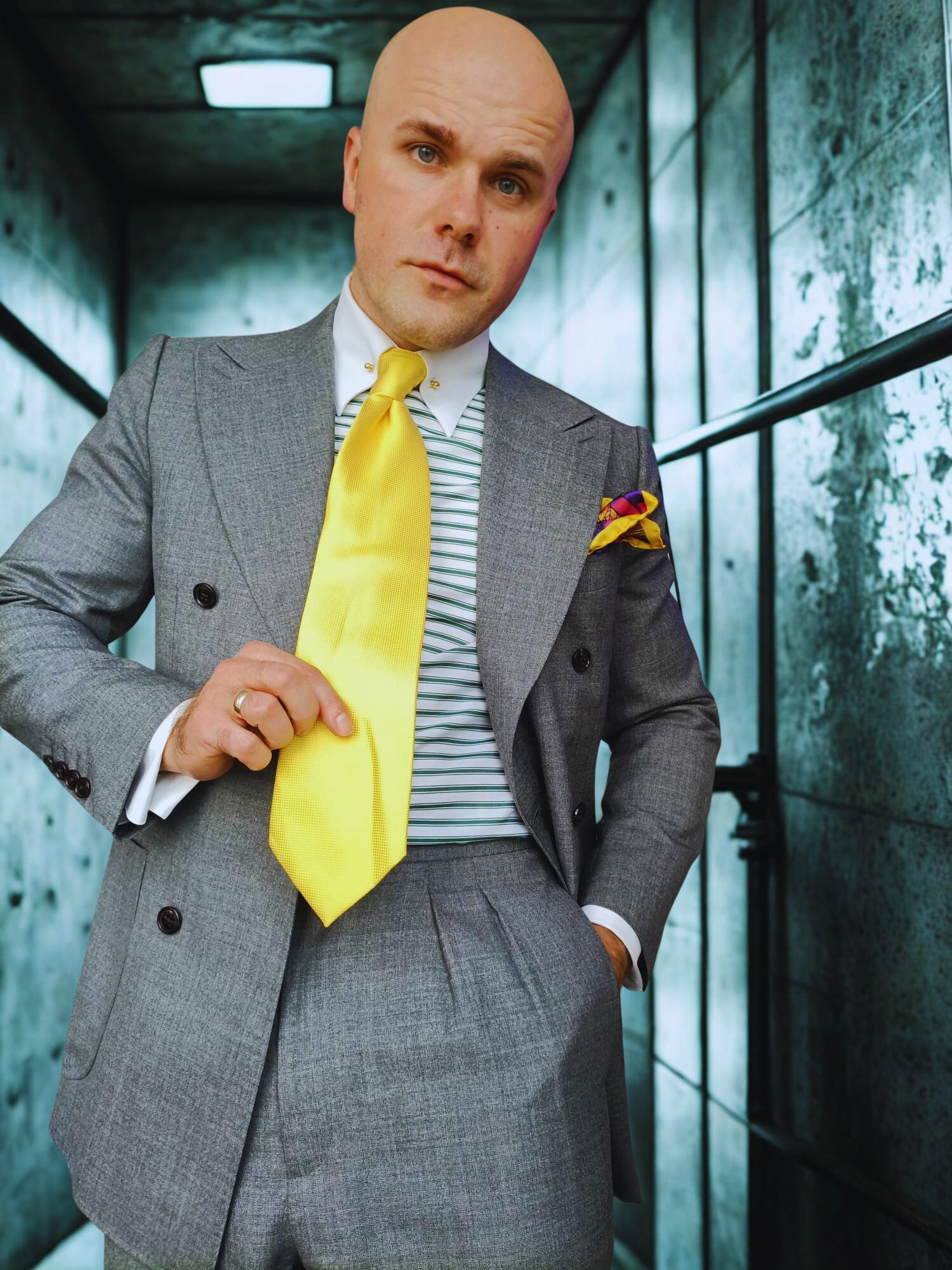 A stranger’s quick double-take as I stepped into the grey morning, suit tailored to order, tie blazing like a small rebellion. Yellow. Not mustard, not pale butter — yellow, alive and unapologetic. The city was still half asleep. People moved like ghosts in graphite coats, eyes glued to their own screens of small distractions. And there I was, cutting through the monotony like a sunbeam that forgot its cue.